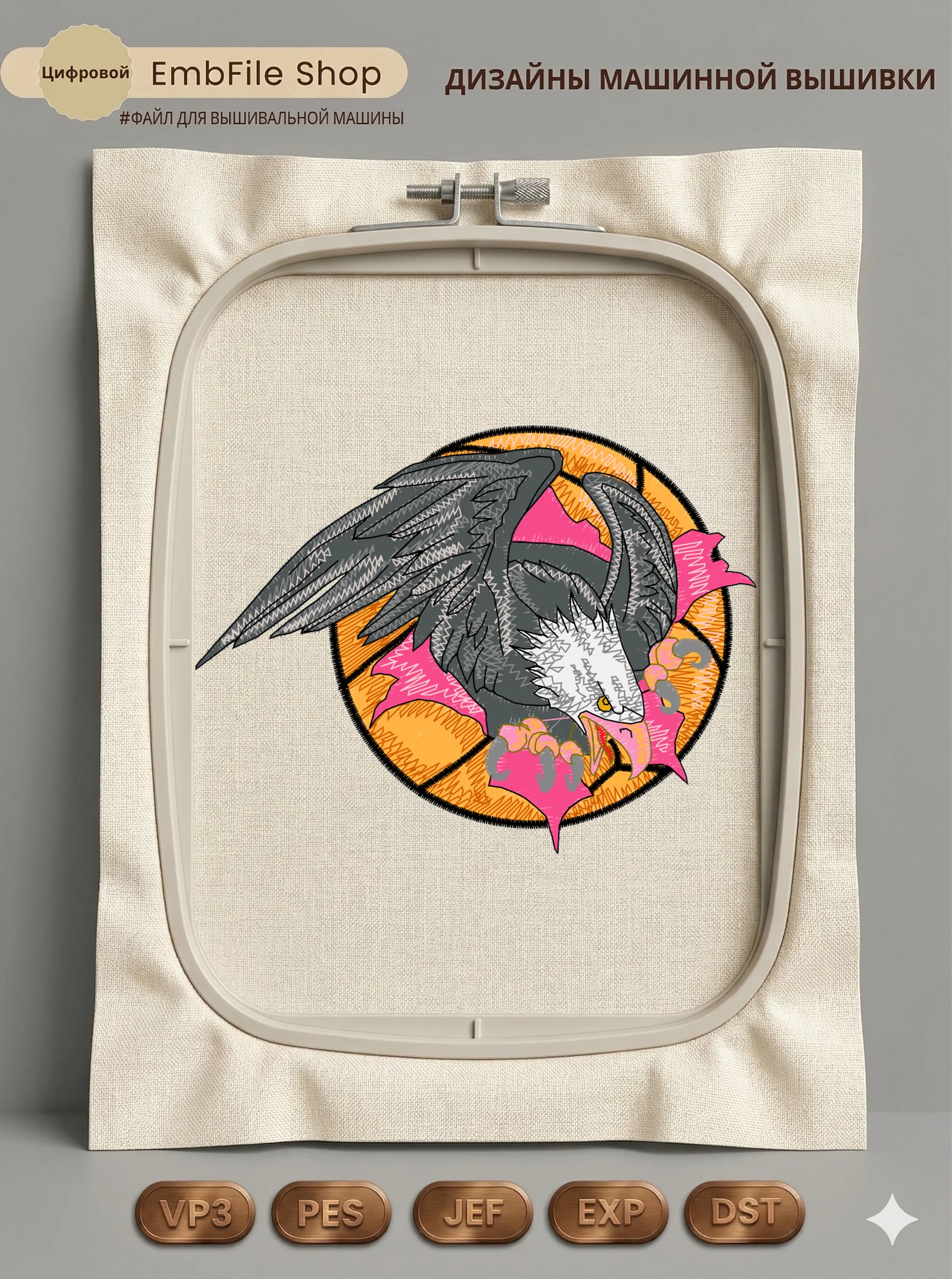 Это цифровой файл для вышивальной машины, а не физический товар (нашивка). Для работы с файлом вам необходимо иметь вышивальную машину и способ передачи файла на устройство (USB-флешка и т.д.).