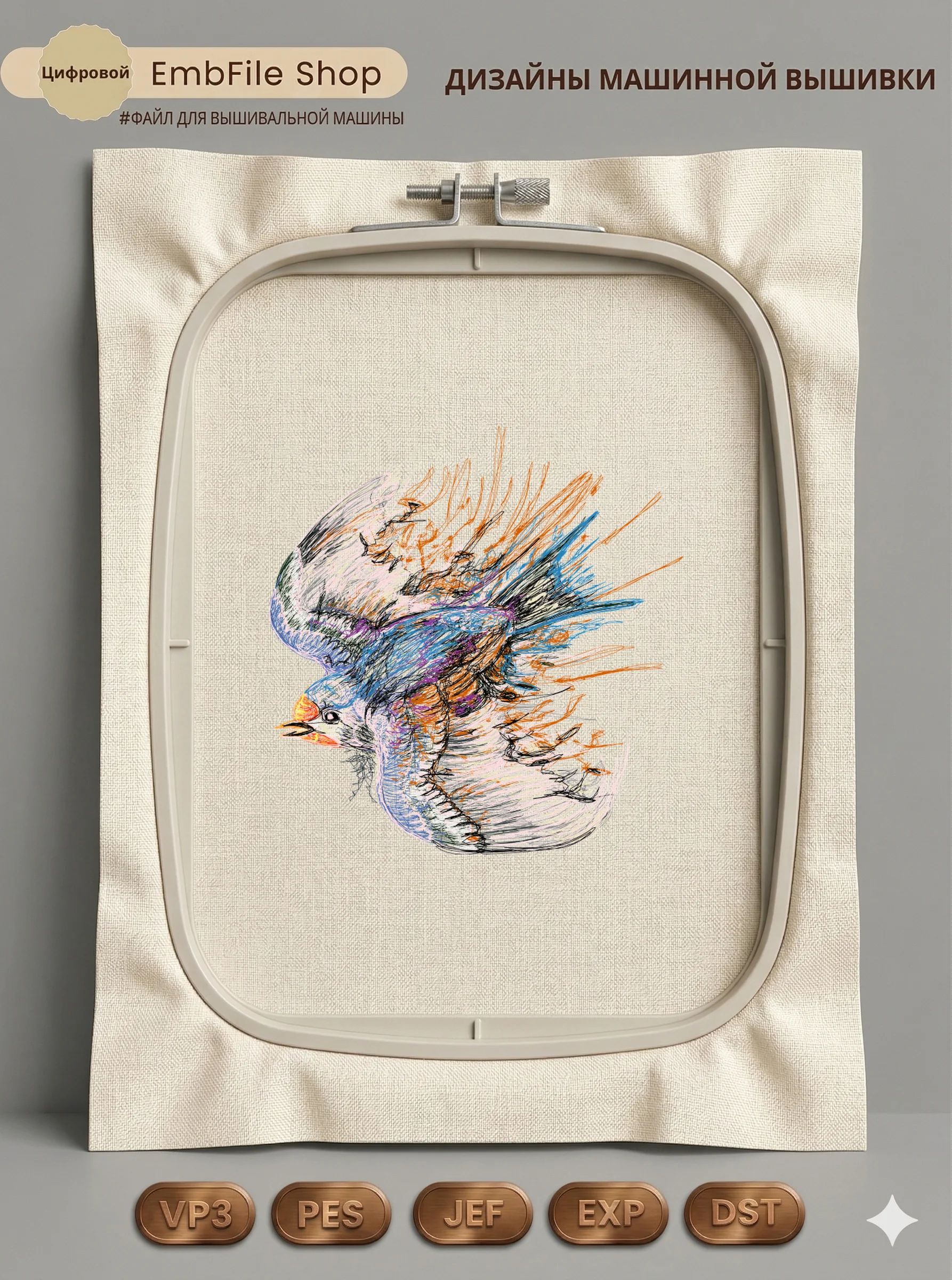 Это цифровой файл для вышивальной машины, а не физический товар (нашивка). Для работы с файлом вам необходимо иметь вышивальную машину и способ передачи файла на устройство (USB-флешка и т.д.).