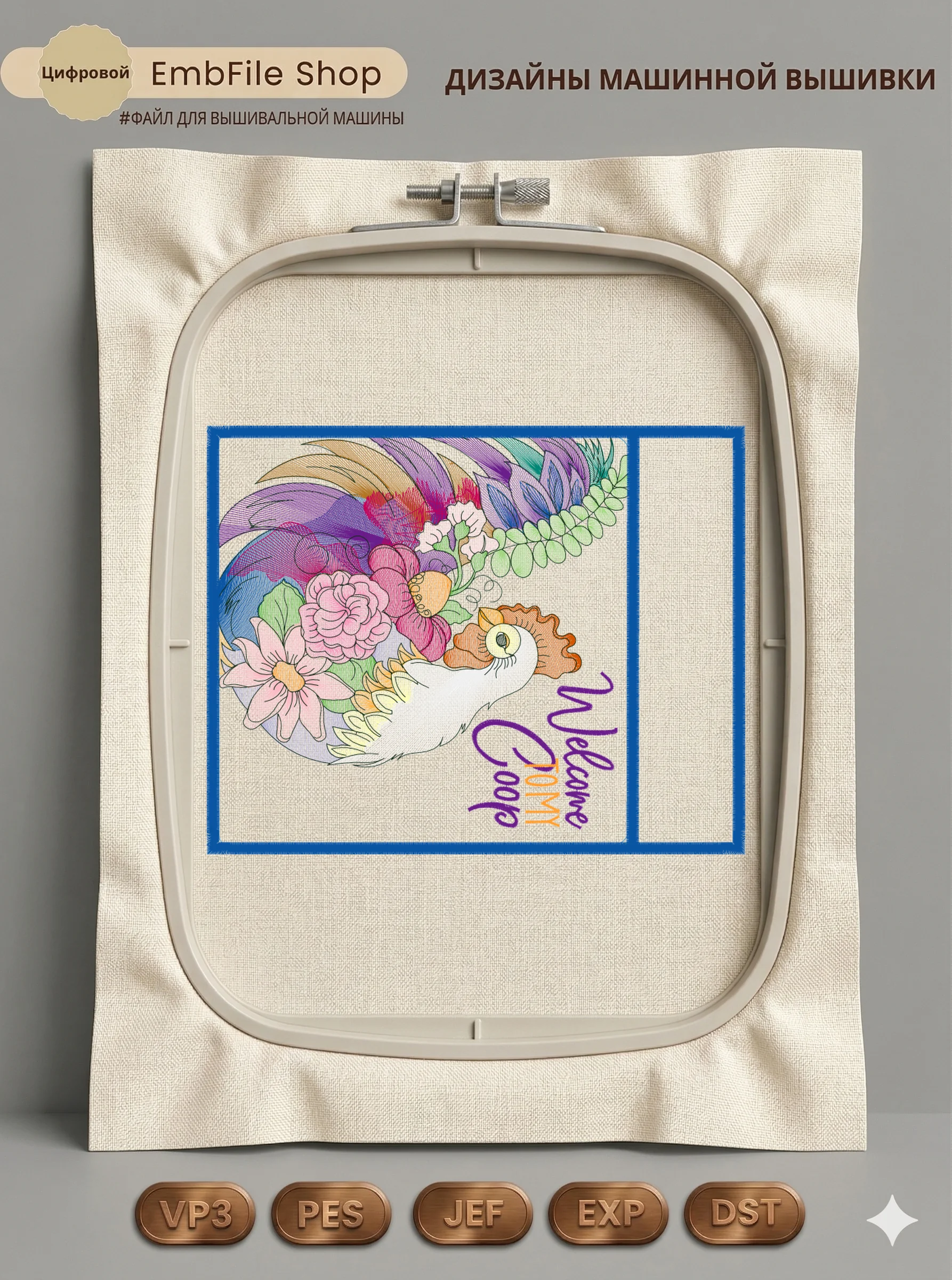 Это цифровой файл для вышивальной машины, а не физический товар (нашивка). Для работы с файлом вам необходимо иметь вышивальную машину и способ передачи файла на устройство (USB-флешка и т.д.).