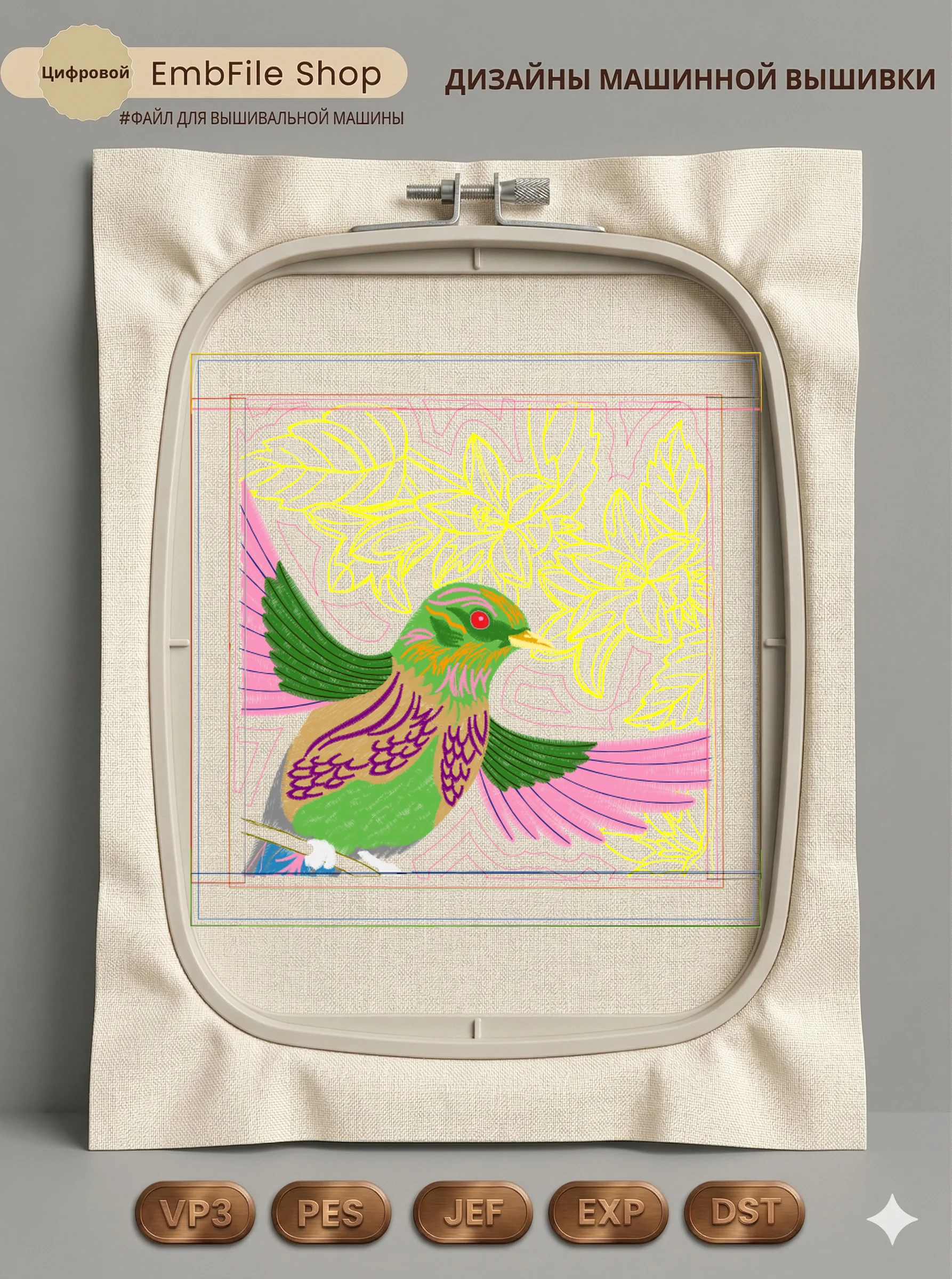 Это цифровой файл для вышивальной машины, а не физический товар (нашивка). Для работы с файлом вам необходимо иметь вышивальную машину и способ передачи файла на устройство (USB-флешка и т.д.).
