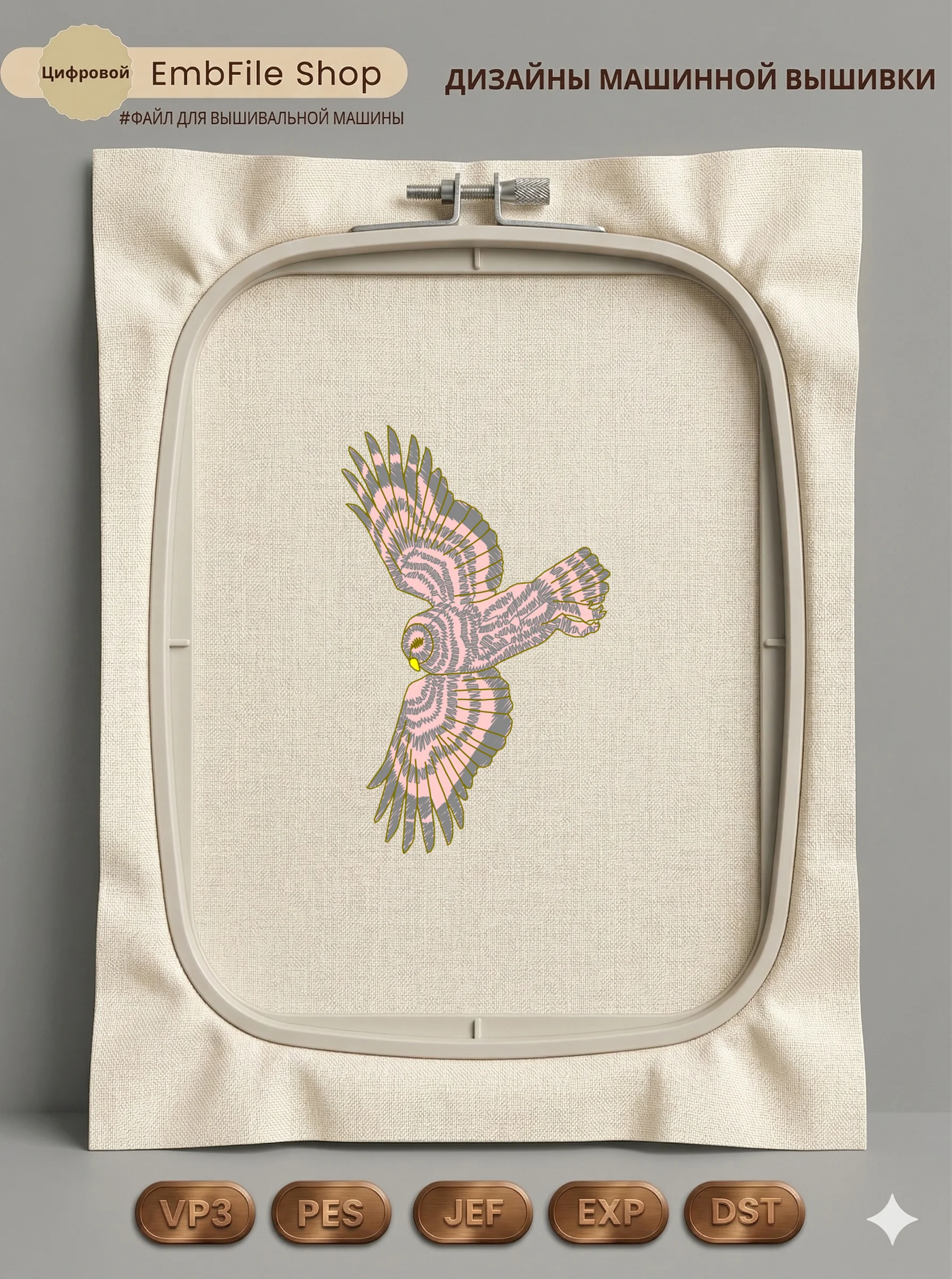 Это цифровой файл для вышивальной машины, а не физический товар (нашивка). Для работы с файлом вам необходимо иметь вышивальную машину и способ передачи файла на устройство (USB-флешка и т.д.).