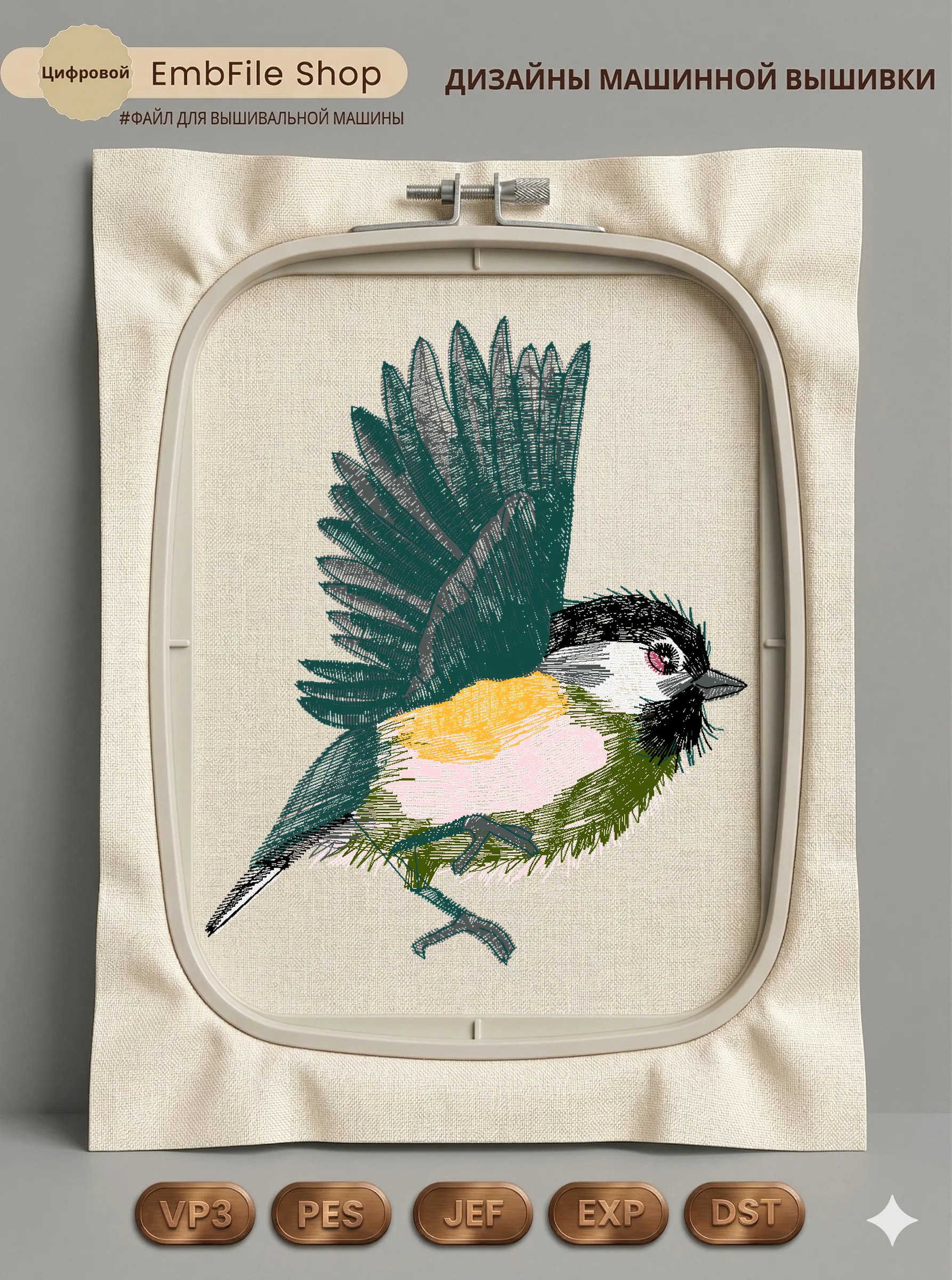 Это цифровой файл для вышивальной машины, а не физический товар (нашивка). Для работы с файлом вам необходимо иметь вышивальную машину и способ передачи файла на устройство (USB-флешка и т.д.).