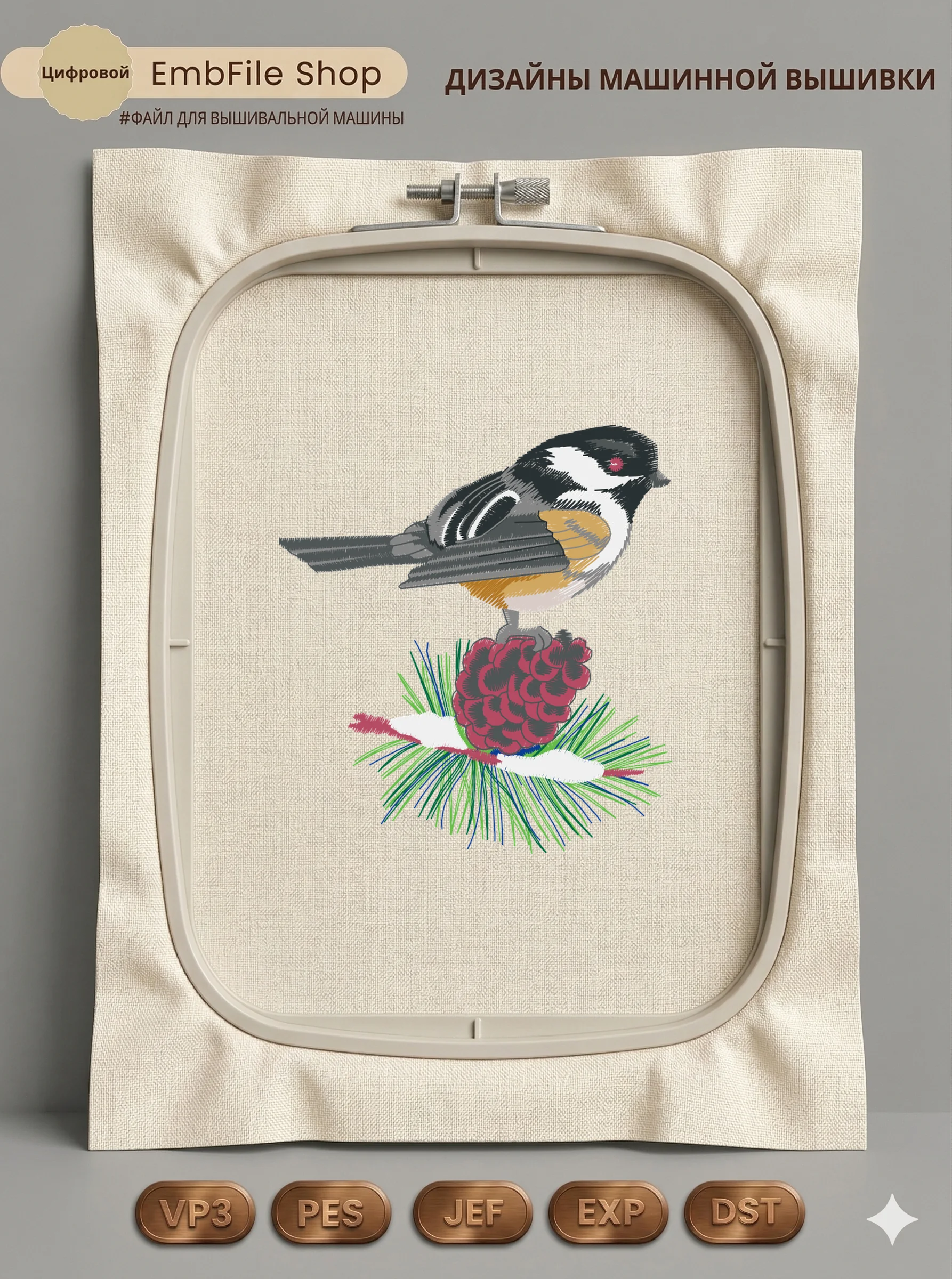 Это цифровой файл для вышивальной машины, а не физический товар (нашивка). Для работы с файлом вам необходимо иметь вышивальную машину и способ передачи файла на устройство (USB-флешка и т.д.).