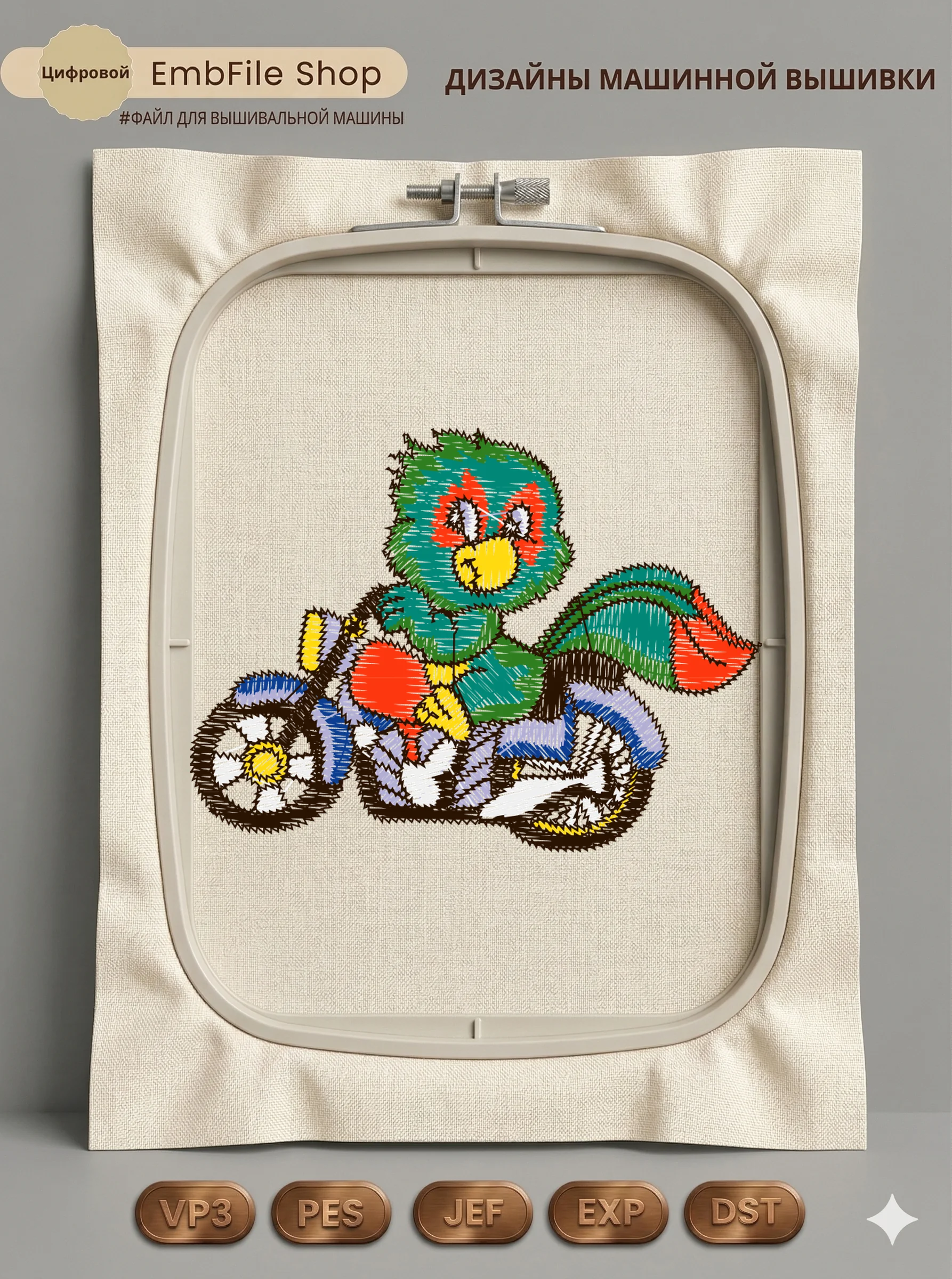 Это цифровой файл для вышивальной машины, а не физический товар (нашивка). Для работы с файлом вам необходимо иметь вышивальную машину и способ передачи файла на устройство (USB-флешка и т.д.).
