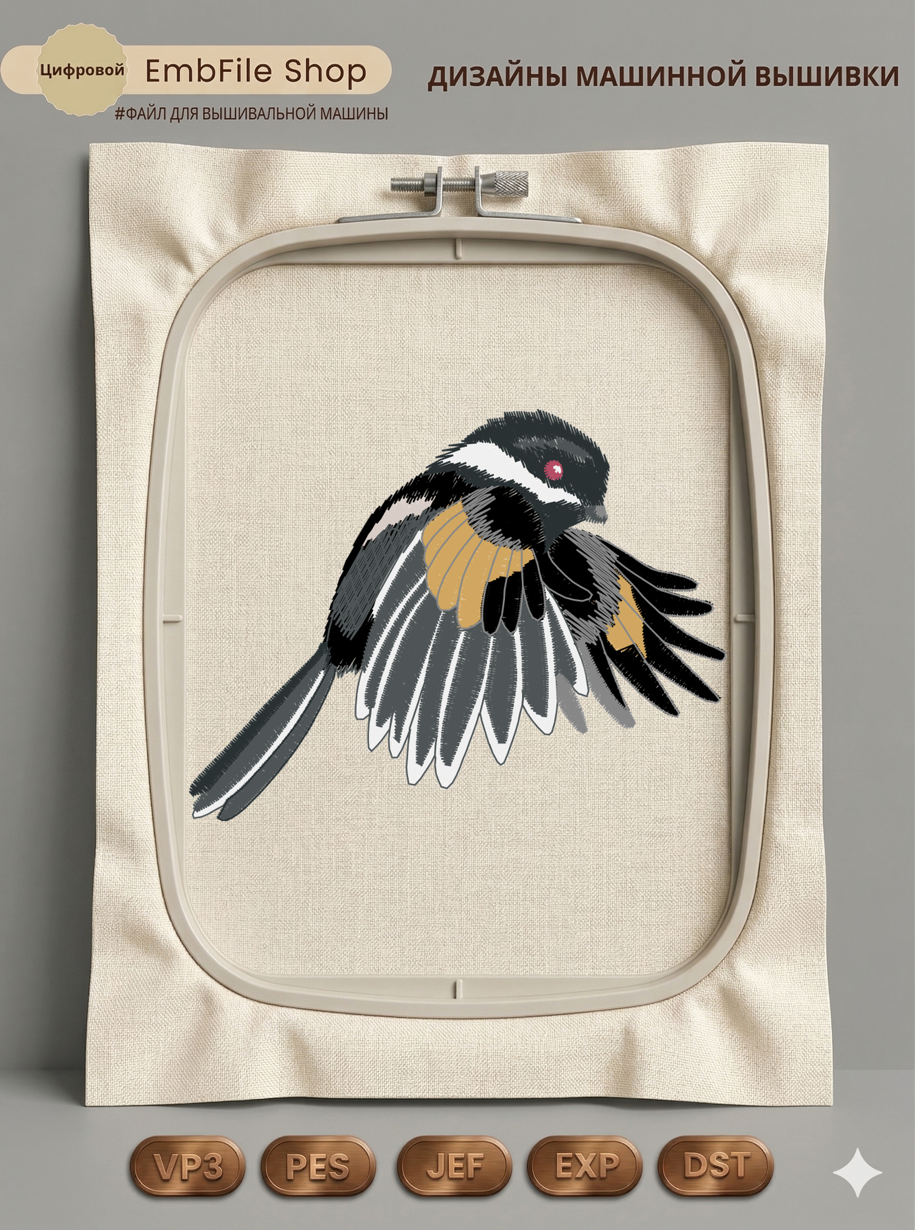 Это цифровой файл для вышивальной машины, а не физический товар (нашивка). Для работы с файлом вам необходимо иметь вышивальную машину и способ передачи файла на устройство (USB-флешка и т.д.).