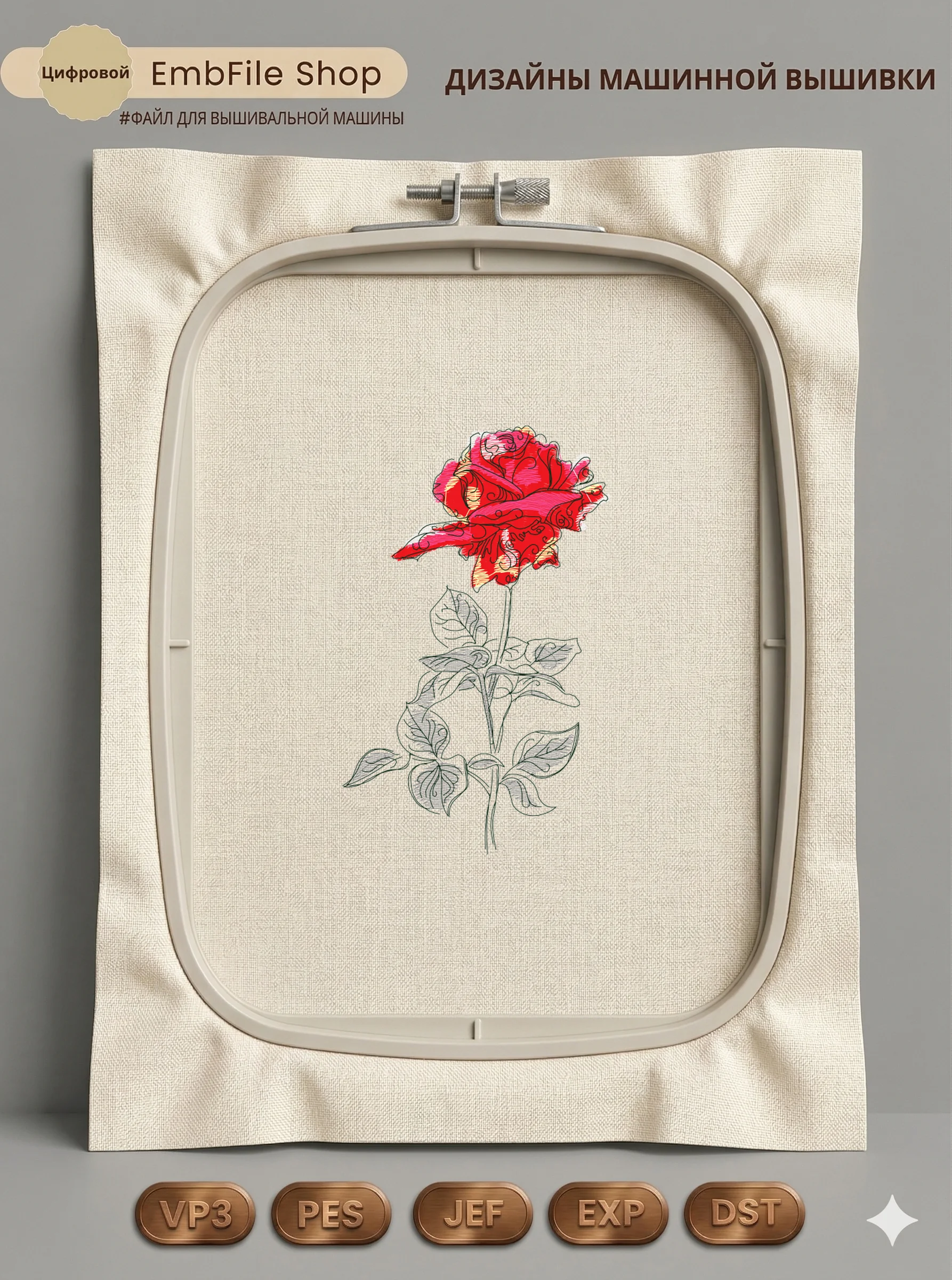 Дизайн машинной вышивки. Роза (Размер 100×160мм). Форматы: DST PES JEF VP3 EXP XXX . Стежков: 11840