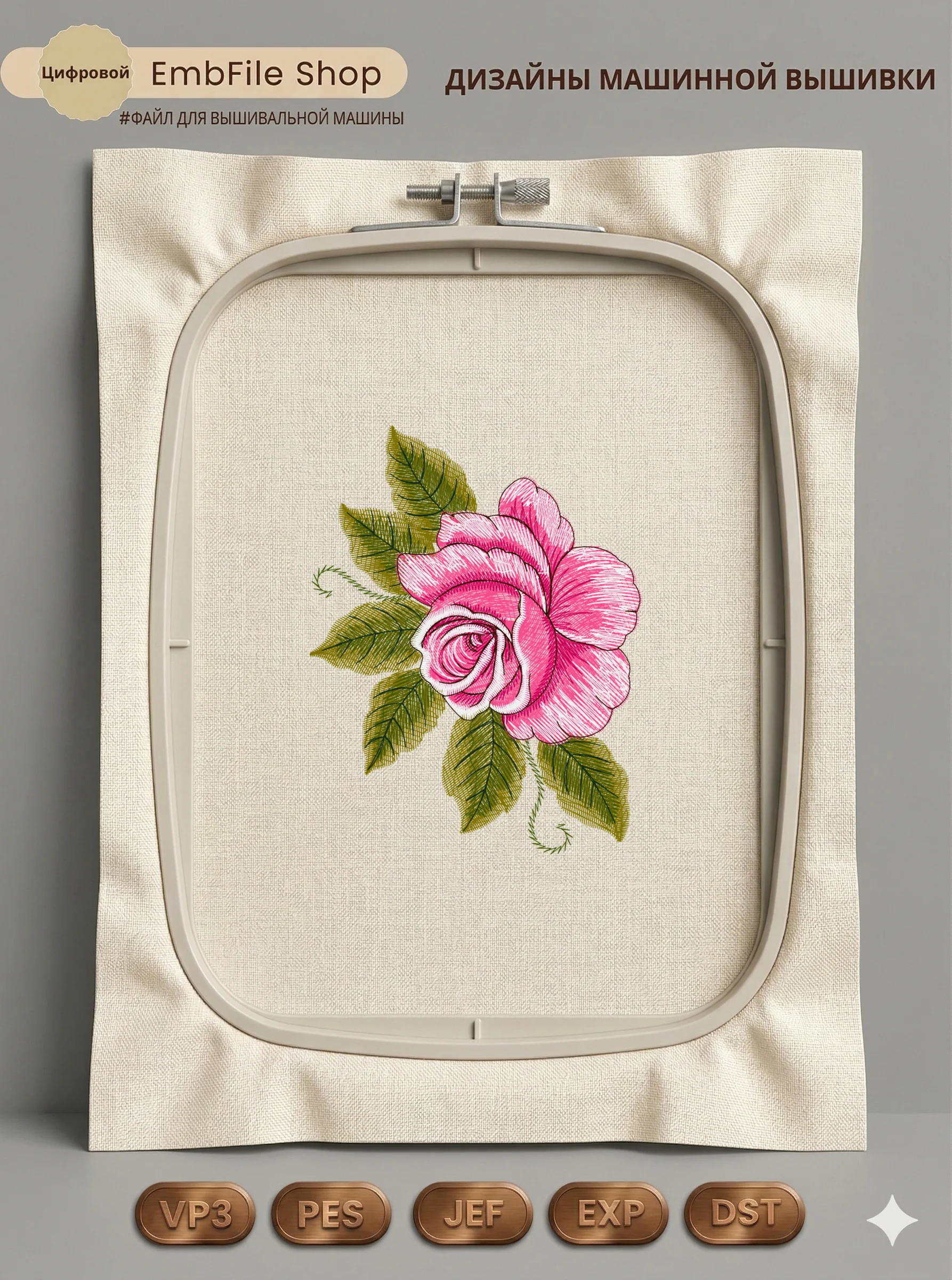 Дизайн машинной вышивки. Роза (Размер 108×140мм). Форматы: DST PES JEF VP3 EXP XXX . Стежков: 18900