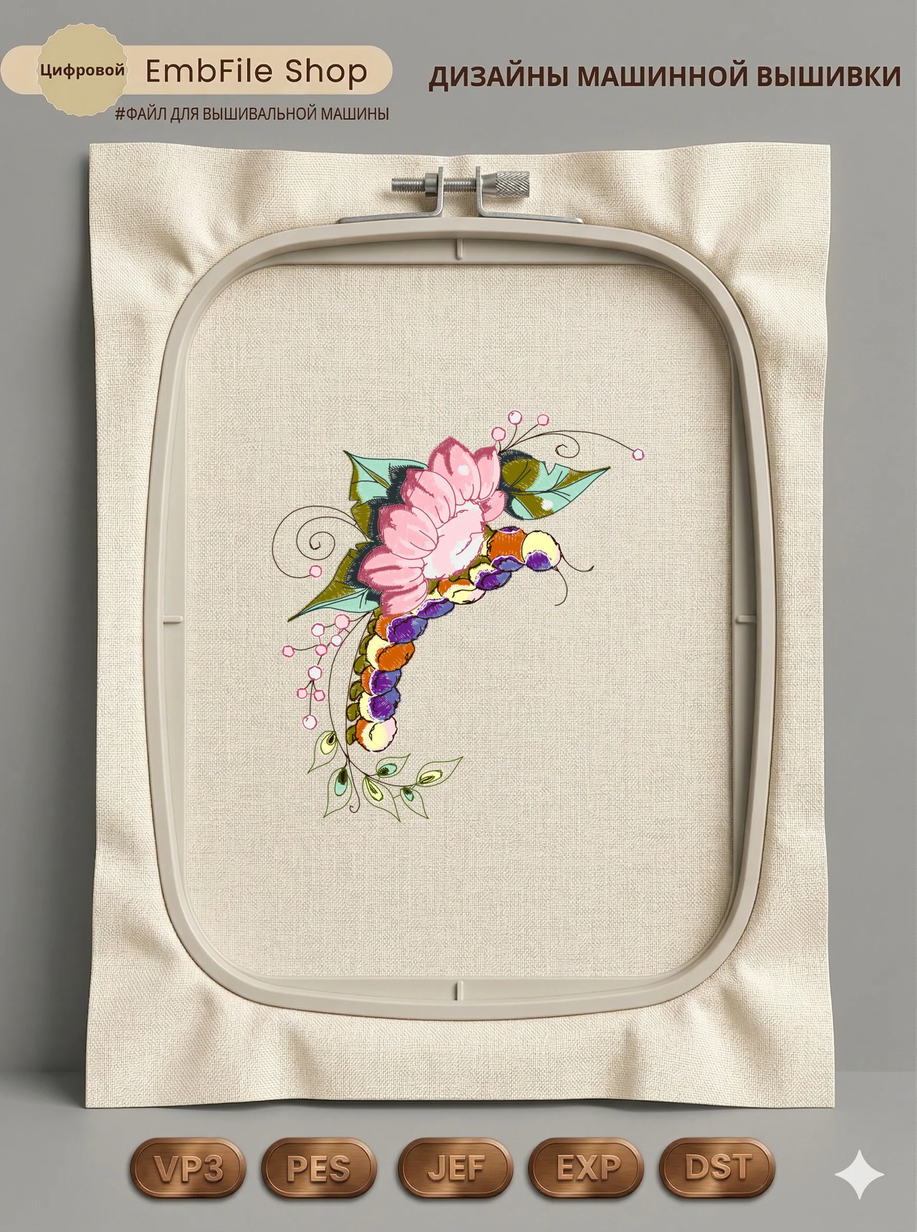 Это цифровой файл для вышивальной машины, а не физический товар (нашивка). Для работы с файлом вам необходимо иметь вышивальную машину и способ передачи файла на устройство (USB-флешка и т.д.).
