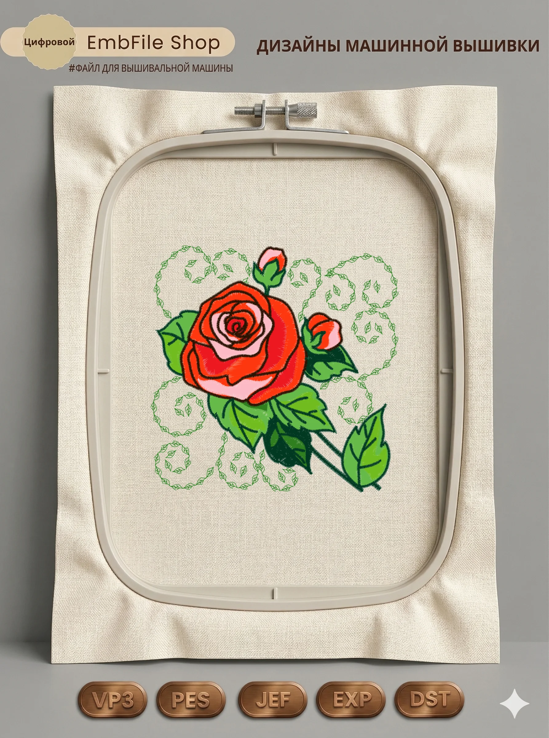 Дизайн машинной вышивки. Роза (Размер 126×125мм). Форматы: DST PES JEF VP3 EXP XXX . Стежков: 27730