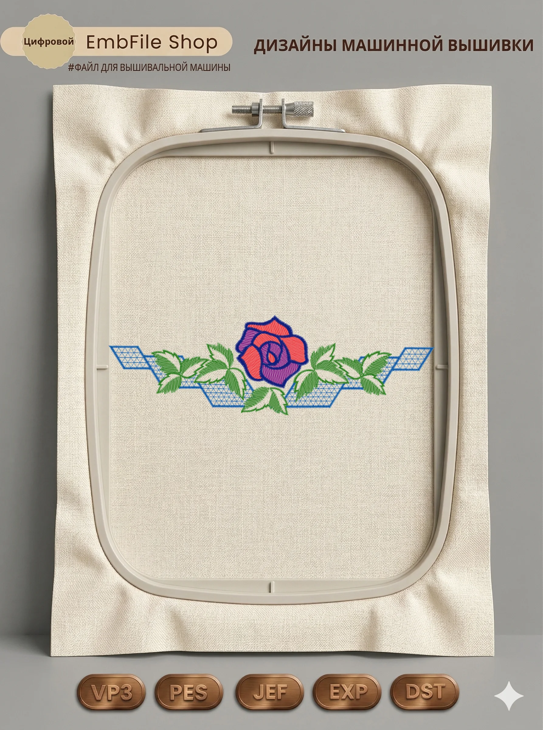 Дизайн машинной вышивки. Роза (Размер 246×76мм). Форматы: DST PES JEF VP3 EXP XXX . Стежков: 10495