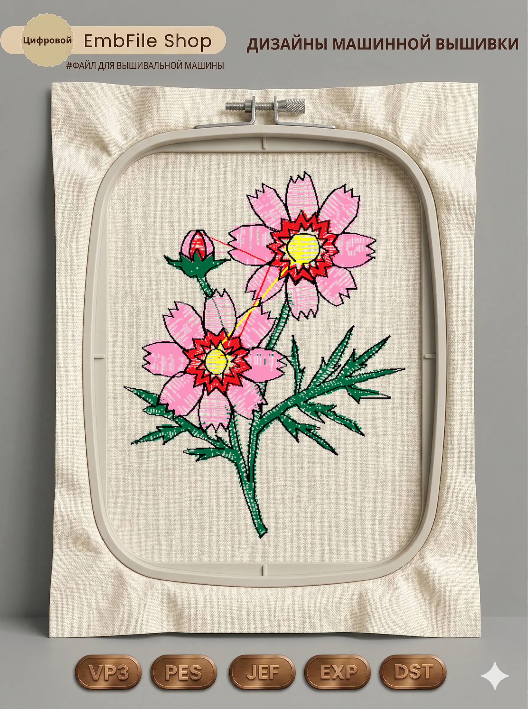 Это цифровой файл для вышивальной машины, а не физический товар (нашивка). Для работы с файлом вам необходимо иметь вышивальную машину и способ передачи файла на устройство (USB-флешка и т.д.).