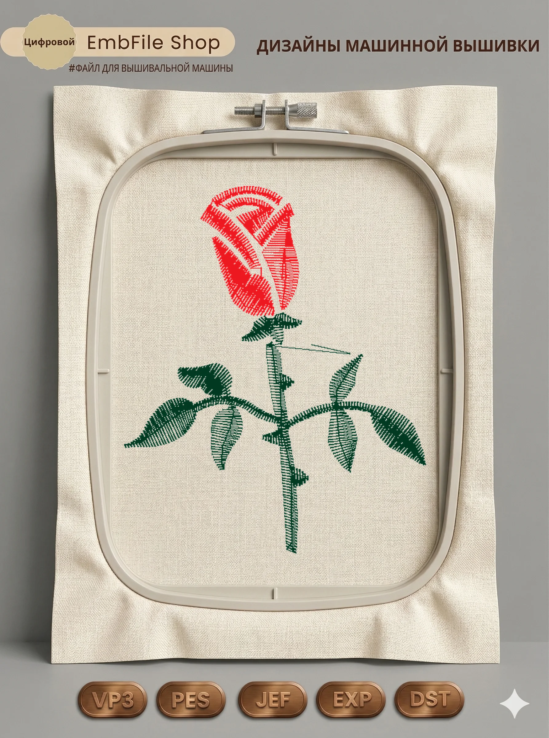 Дизайн машинной вышивки. Роза (Размер 42×51мм). Форматы: DST PES JEF VP3 EXP XXX . Стежков: 1174