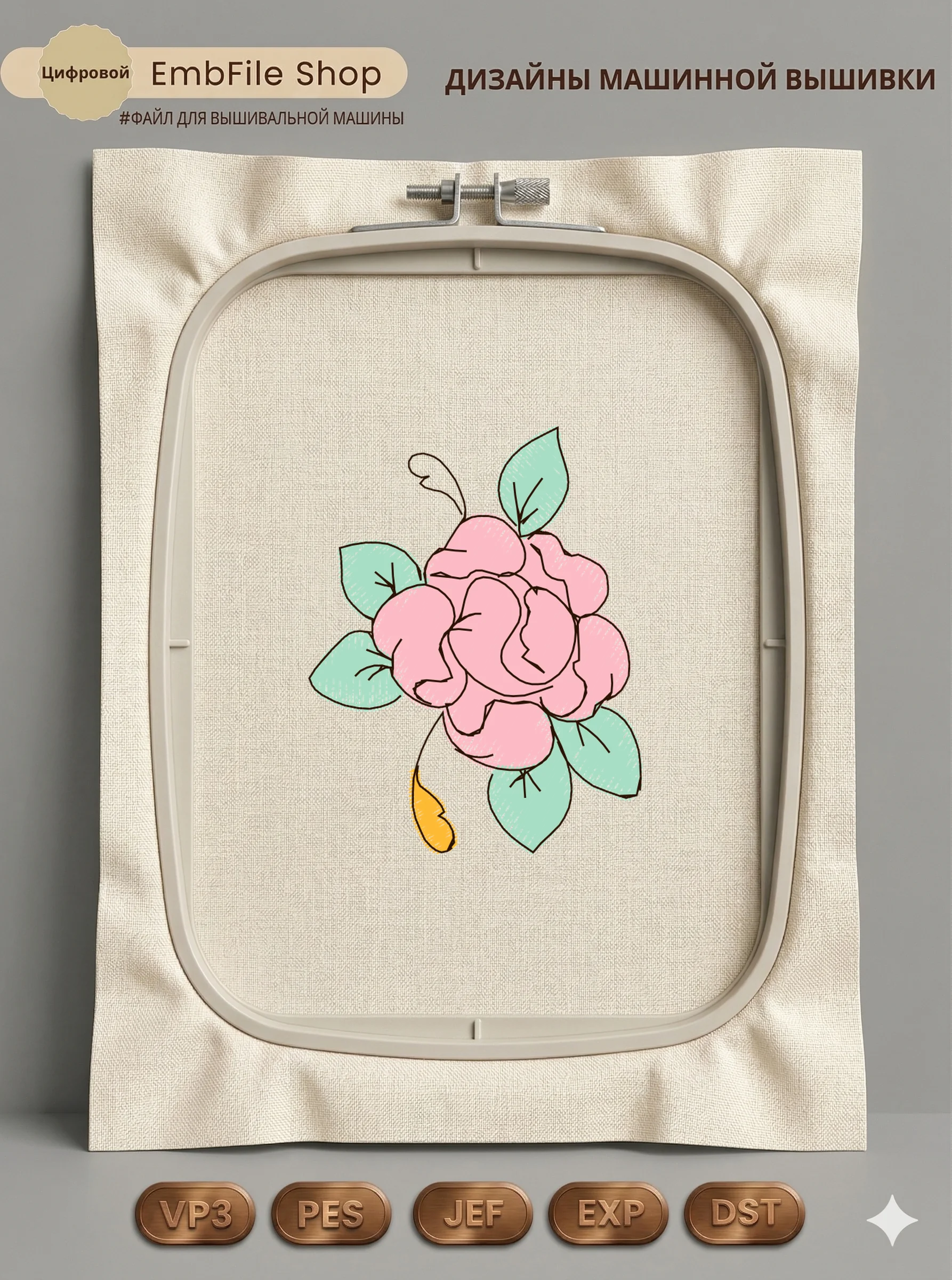 Дизайн машинной вышивки. Роза (Размер 50×64мм). Форматы: DST PES JEF VP3 EXP XXX . Стежков: 4807