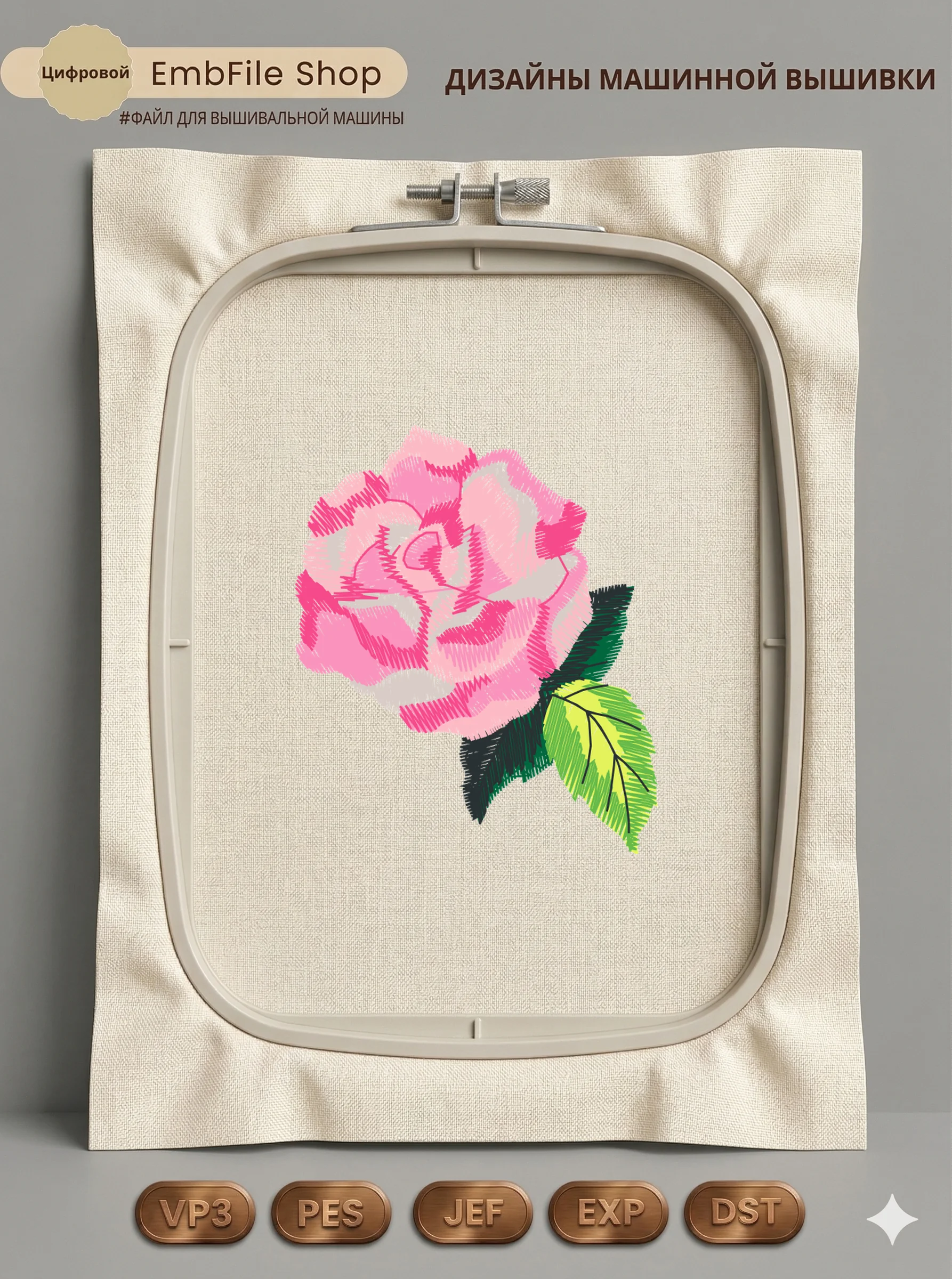 Дизайн машинной вышивки. Роза (Размер 51×61мм). Форматы: DST PES JEF VP3 EXP XXX . Стежков: 7031