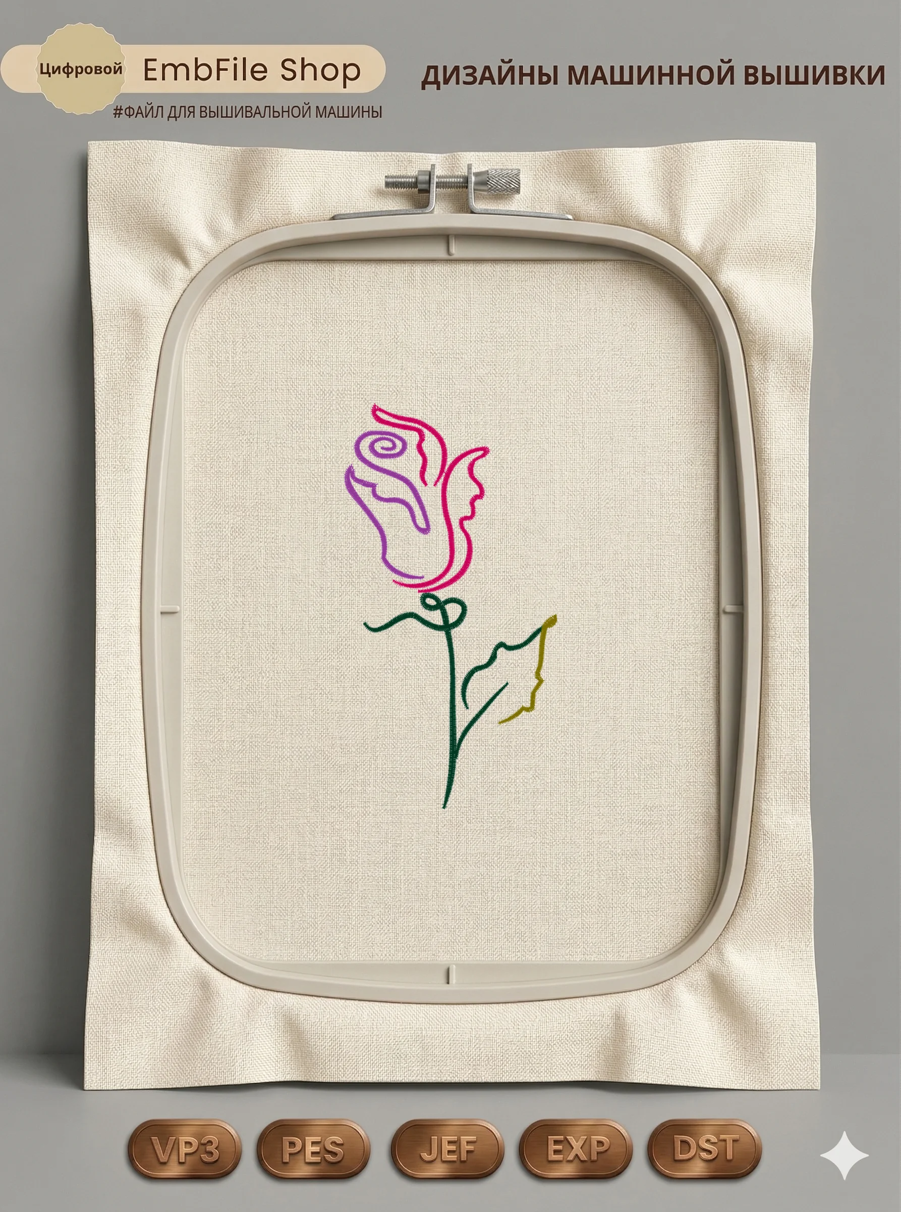 Дизайн машинной вышивки. Роза (Размер 69×131мм). Форматы: DST PES JEF VP3 EXP XXX . Стежков: 3577