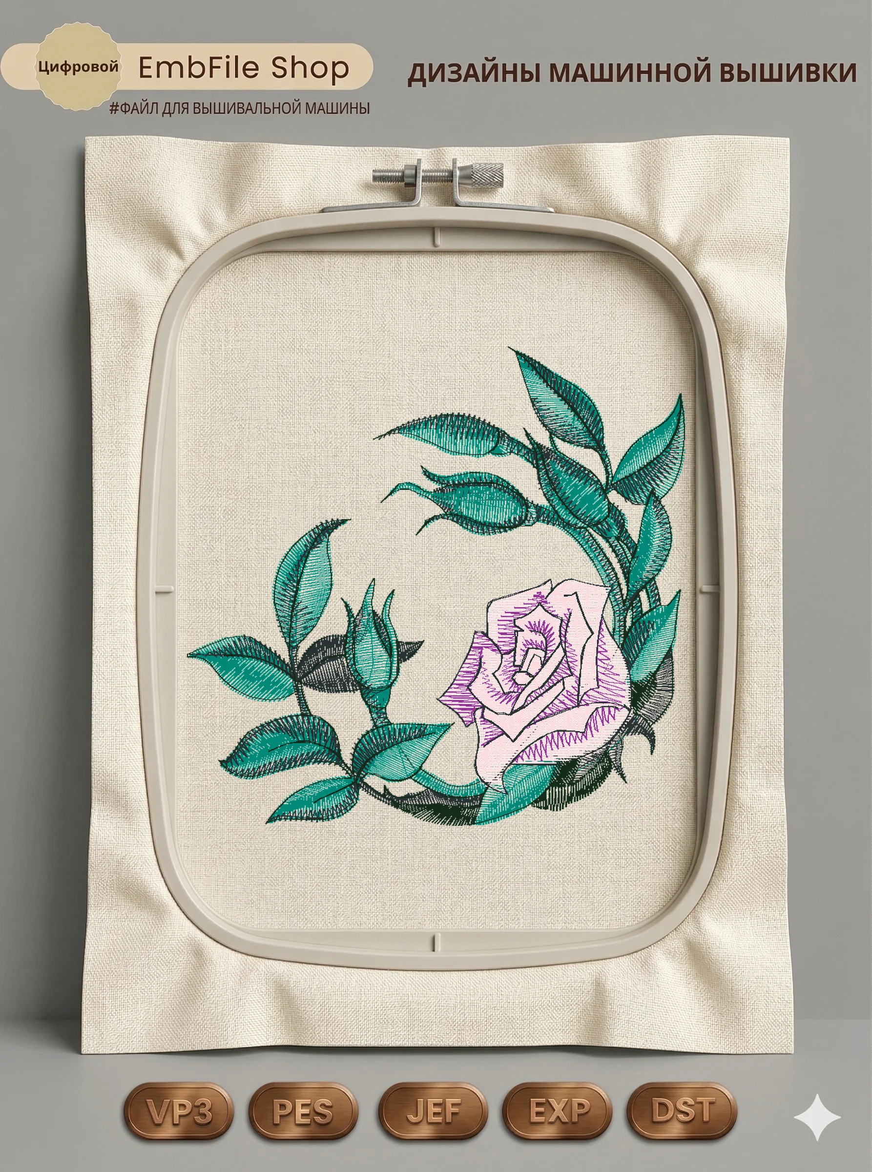 Дизайн машинной вышивки. Роза (Размер 75×72мм). Форматы: DST PES JEF VP3 EXP XXX . Стежков: 9879