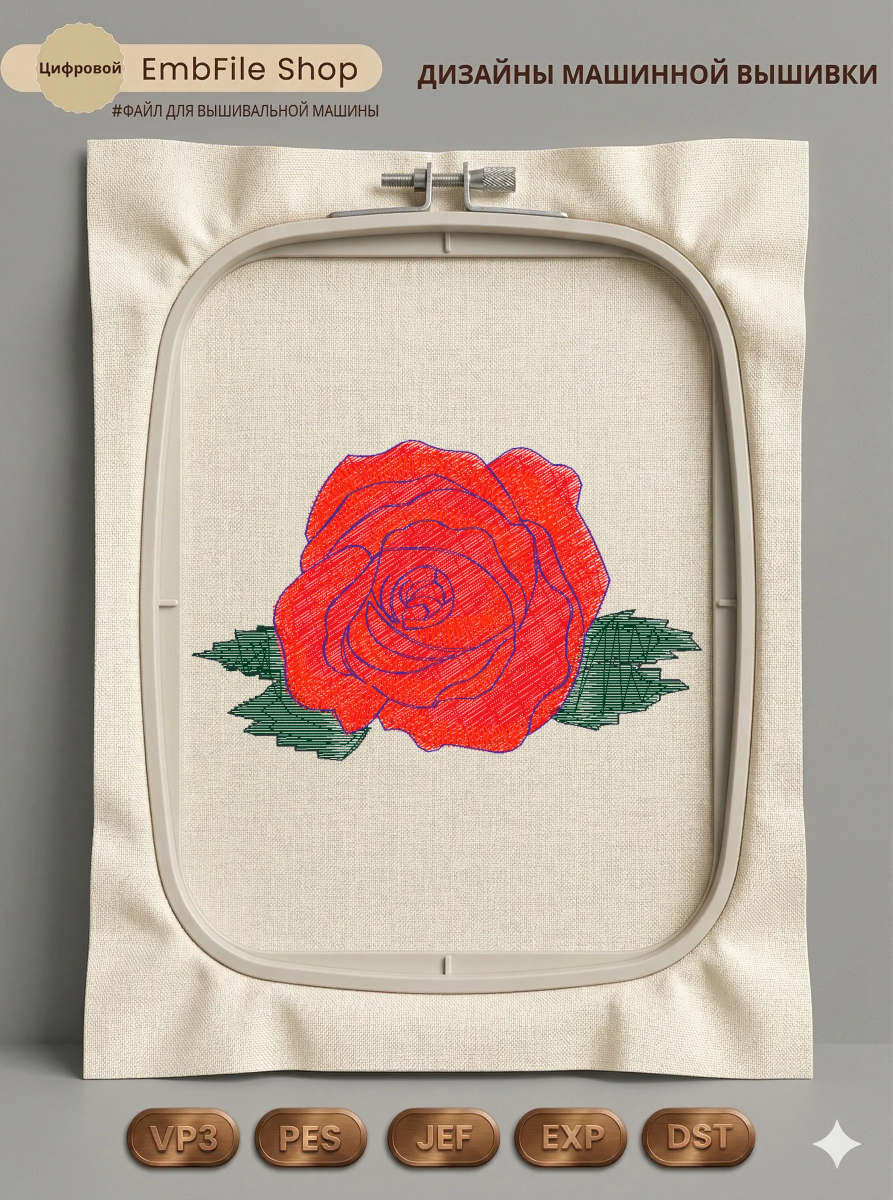Дизайн машинной вышивки. Роза (Размер 76×48мм). Форматы: DST PES JEF VP3 EXP XXX . Стежков: 6821