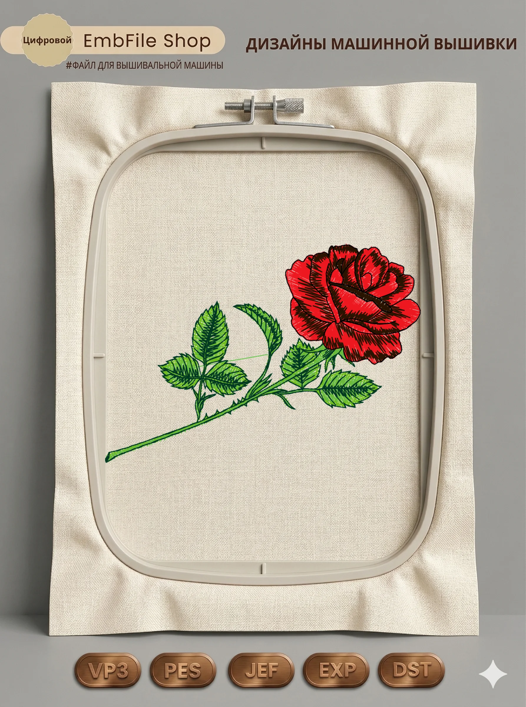 Дизайн машинной вышивки. Роза (Размер 99×68мм). Форматы: DST PES JEF VP3 EXP XXX . Стежков: 12895