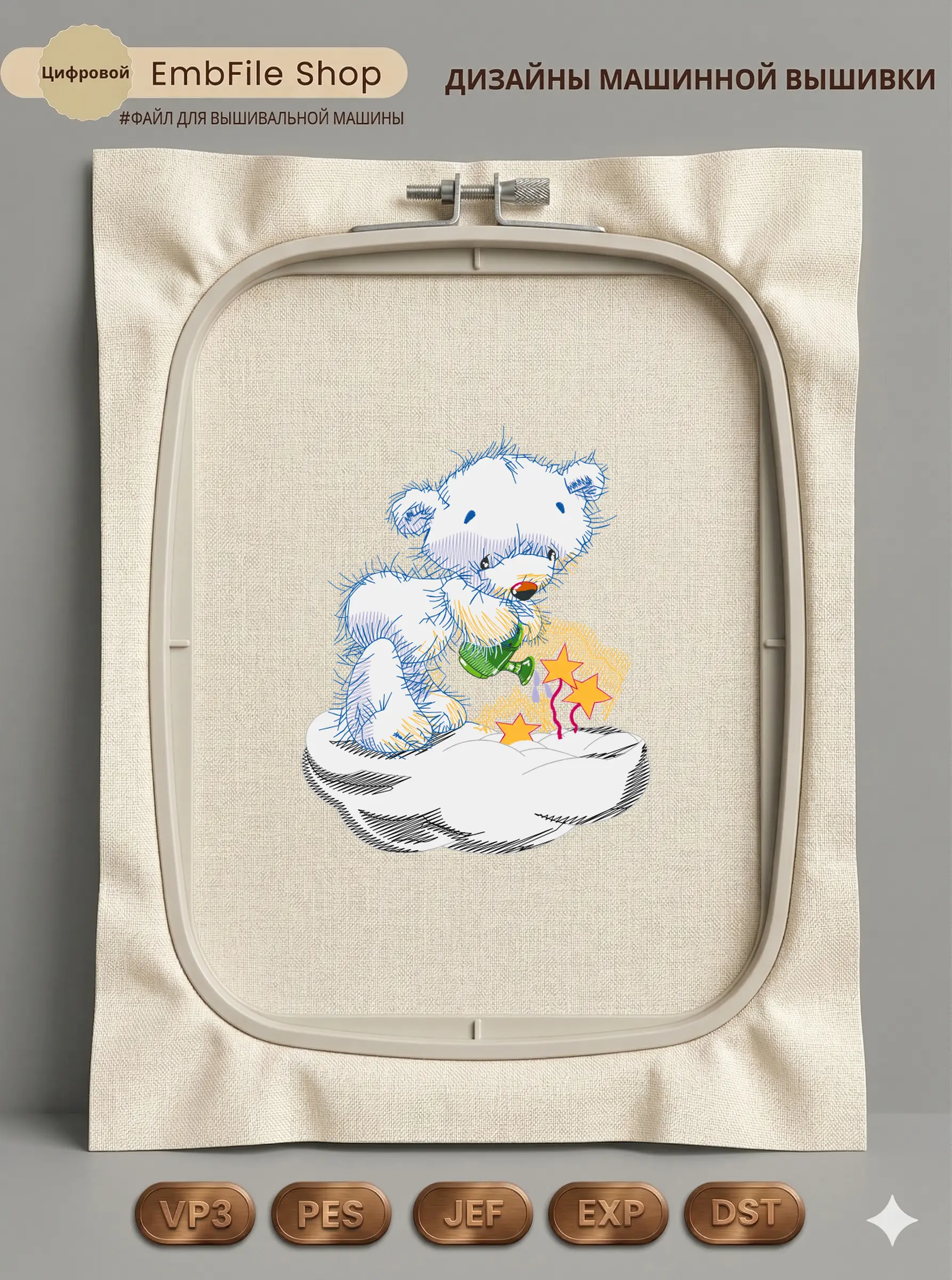 Это цифровой файл для вышивальной машины, а не физический товар (нашивка). Для работы с файлом вам необходимо иметь вышивальную машину и способ передачи файла на устройство (USB-флешка и т.д.).